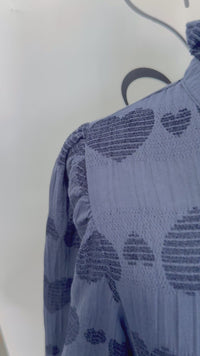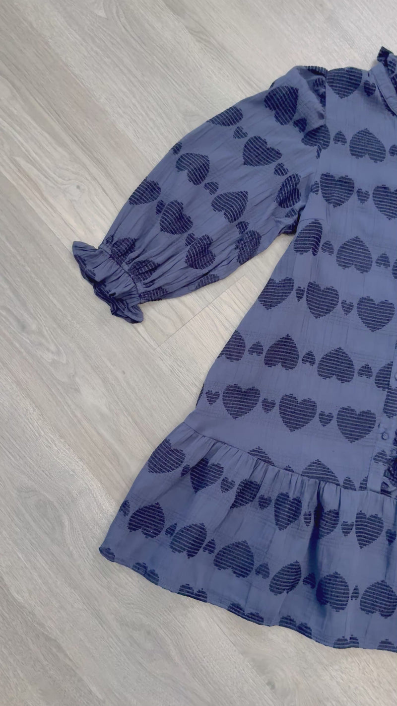 This charming navy frock features delicate hearts woven into every inch of fabric, giving it instant personality. The three-quarter sleeves are trimmed with a ruffled collar, while matching ruffles cascade down the button-front bodice for extra flair. A drop waist creates a flattering silhouette that flows into a playful ruffled skirt. Perfect for adding a touch of whimsy to your wardrobe! Not lined. 100% Cotton.