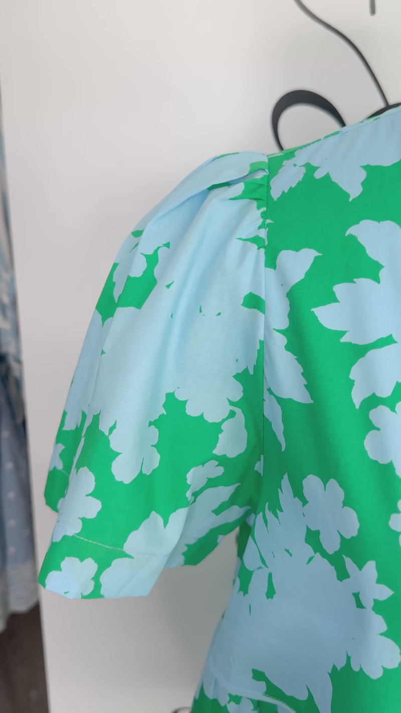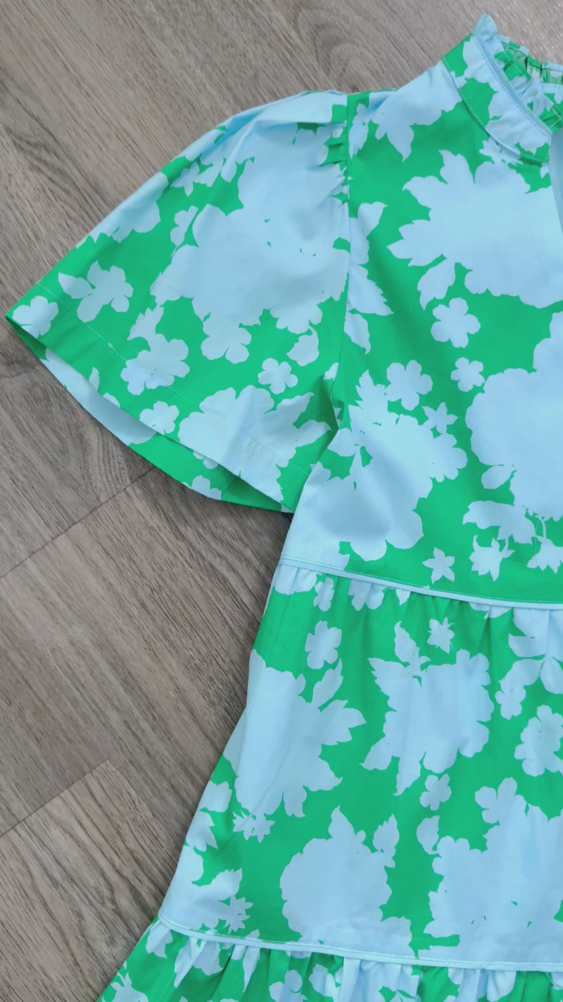 The Candace Dress is a charming summer essential that combines style with everyday practicality. This short mini dress features a beautiful aqua blue and kelly green floral print that captures the essence of warm-weather fashion. Designed with comfort in mind, the dress showcases a flattering V-neckline paired with comfortable short sleeves—perfect for staying cool while maintaining an elegant silhouette. T