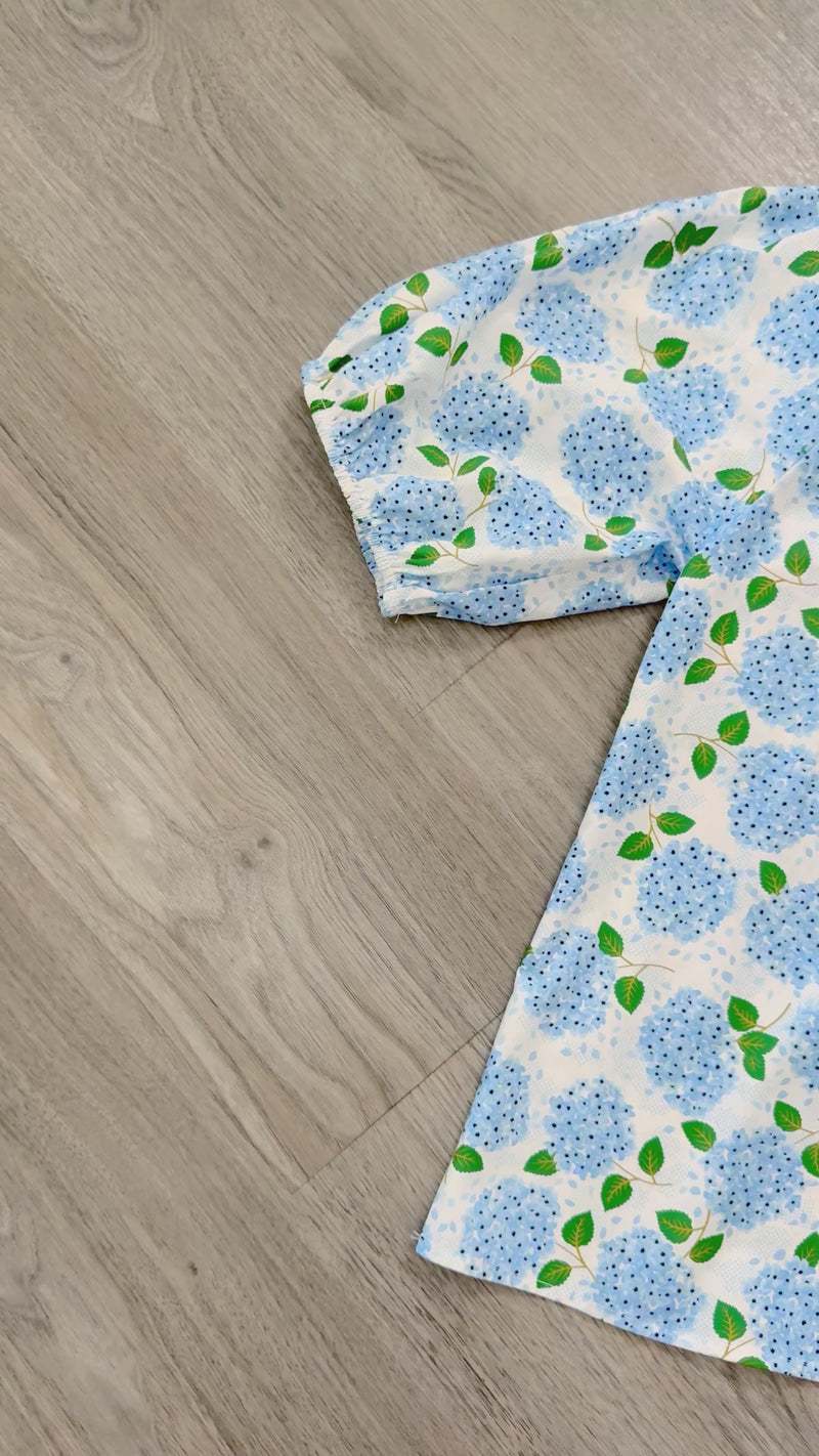 This charming blouse features a delicate hydrangea pattern in soft blue tones, complemented by romantic puff sleeves and elegant smocking detail at the neckline. Perfect for adding a touch of botanical elegance to your everyday wardrobe. Elastic at sleeve opening.  V at neck. 100% Cotton.