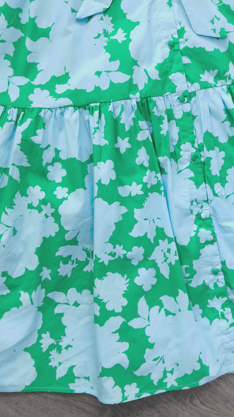 The Wynette Dress is a charming midi silhouette that combines timeless style with everyday practicality. Featuring a vibrant aqua blue and kelly green floral print, this dress brings a fresh, botanical elegance to your wardrobe. Designed with thoughtful details, the dress includes short sleeves with elastic at the elbow for a flattering, adjustable fit.