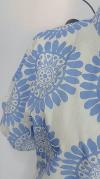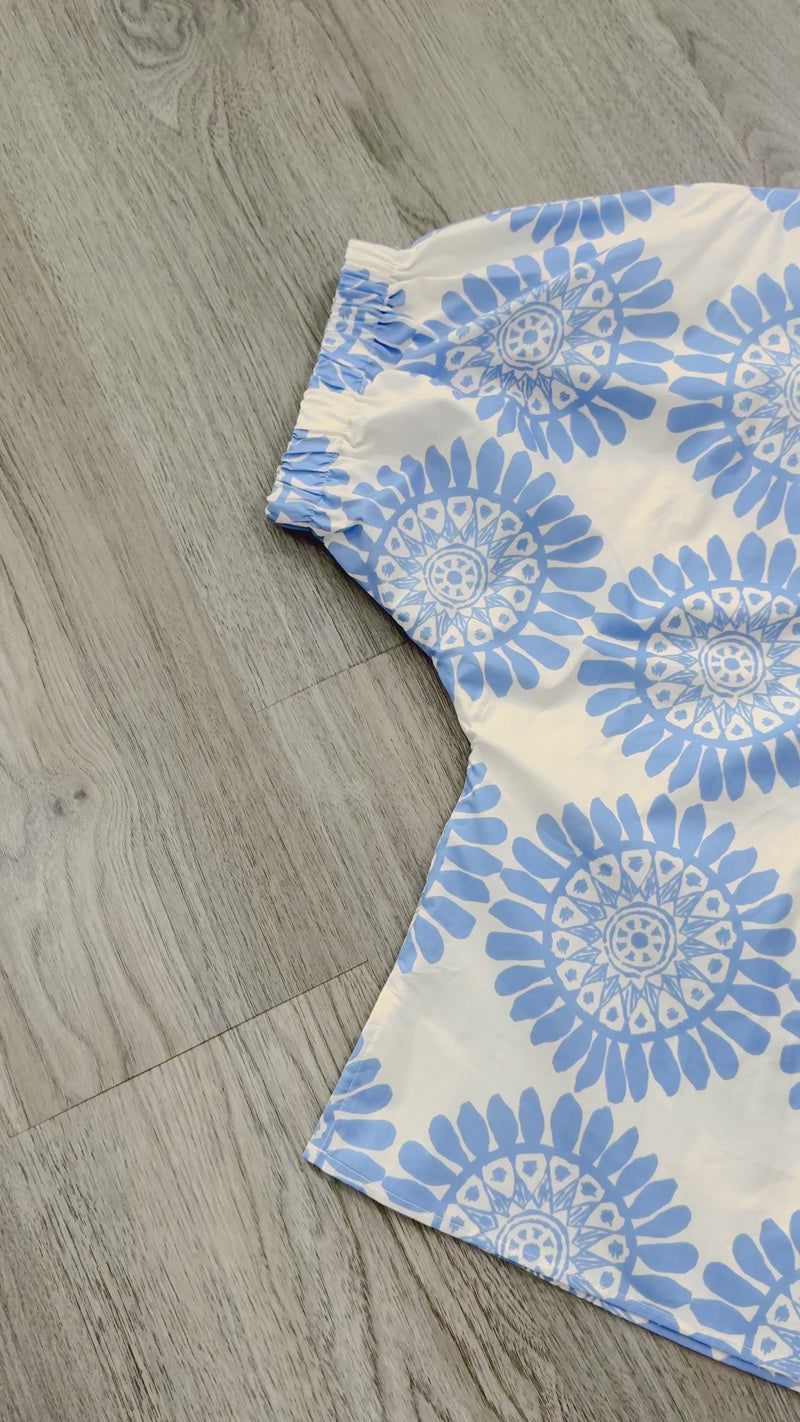 Introducing The Olivia Top in light blue and white, a versatile wardrobe essential that combines timeless style with everyday comfort. This beautifully crafted top features an elegant navy and white medallion print that adds visual interest and pairs effortlessly with your favorite bottoms. The flattering V-neckline creates a refined silhouette, while the relaxed sleeves offer a comfortable, laid back fit perfect for casual outings or relaxed workdays. Elastic detailing at the elbows provides a subtle gathered effect that prevents the sleeves from slipping while maintaining the piece's relaxed aesthetic. Whether you're dressing up with tailored trousers or keeping it casual with denim, The Olivia Top delivers sophisticated style with the comfort you crave. A must-have piece for building a cohesive, effortless wardrobe. 100% Cotton.