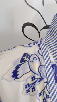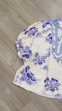 Featuring a charming blue and white floral print, this relaxed-fit top showcases a distinctive striped collar detail in coordinating hues. The relaxed puff sleeves are finished with elastic cuffs for a polished, gathered look that balances the garment's easygoing silhouette. V at neck. 80% Rayon, 20% Nylon.